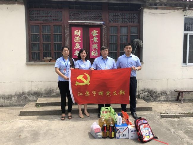 在端午节及建党97周年即将来临之际,由江苏宇辉党支部倡议,江苏宇辉工会、江苏宇辉团委积极组织,在晨源职业技能培训学校的牵线搭桥下,2018年6月16日上午,江苏宇辉党支部书记全文林同志、江苏宇辉党办主任、工会主席周玉霞同志、江苏宇辉团委书记陆影同志带领江苏宇辉党支部、工会、团委成员来到蒋垛村三户贫困家庭,将饱含心意的慰问品和救助金,送到了他们的手里和心里。