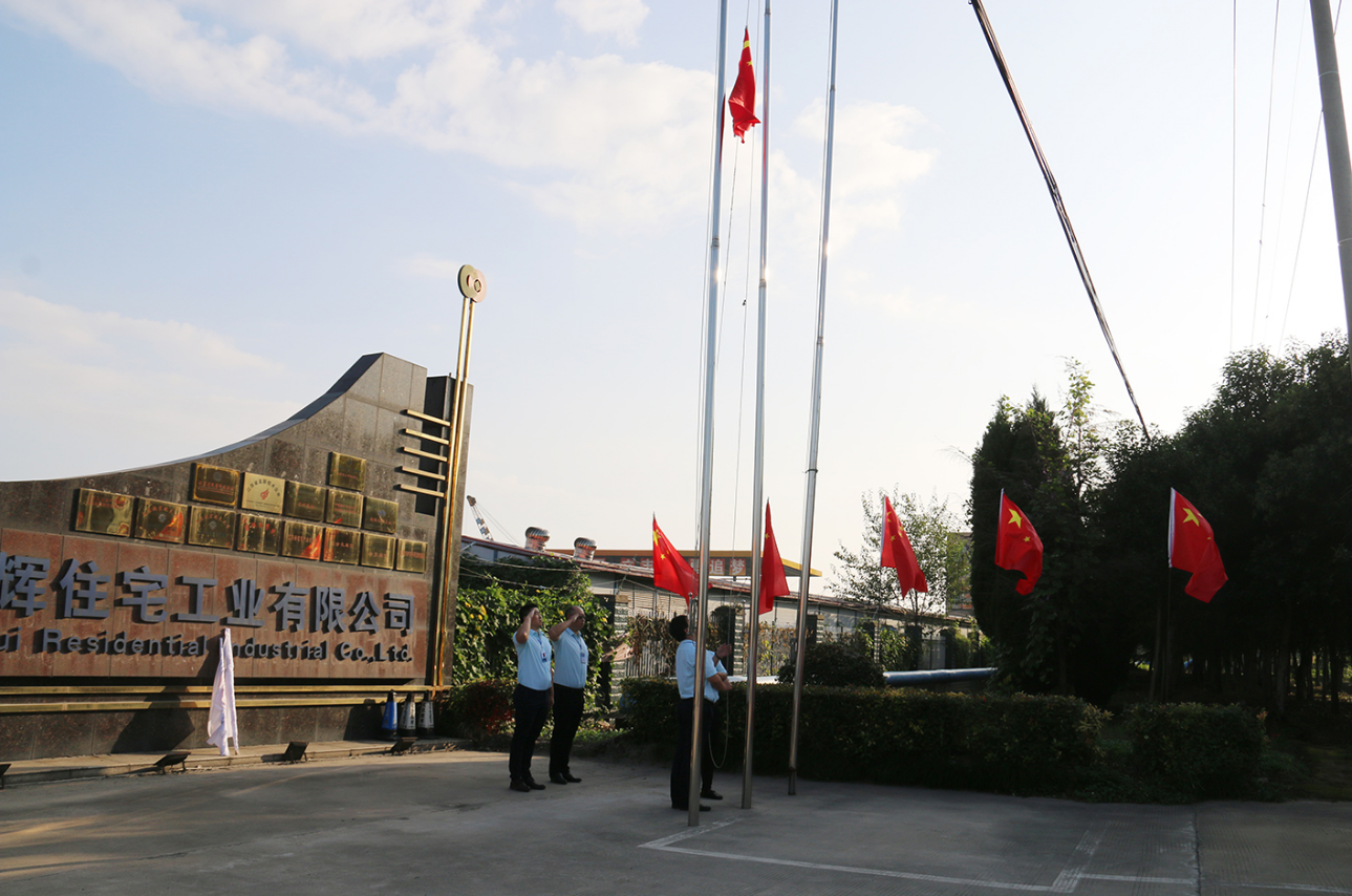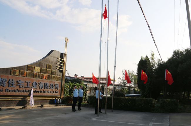 江苏宇辉党支部书记全文林宣布升国旗仪式正式开始。升旗手们迈着铿锵有力的步伐,将五星红旗护送至升旗台,伴随着雄壮的国歌声响彻云霄,鲜艳的五星红旗冉冉升起,宇辉全体员工面向国旗整齐排列、行庄严注目礼,表达他们最崇高的敬意。