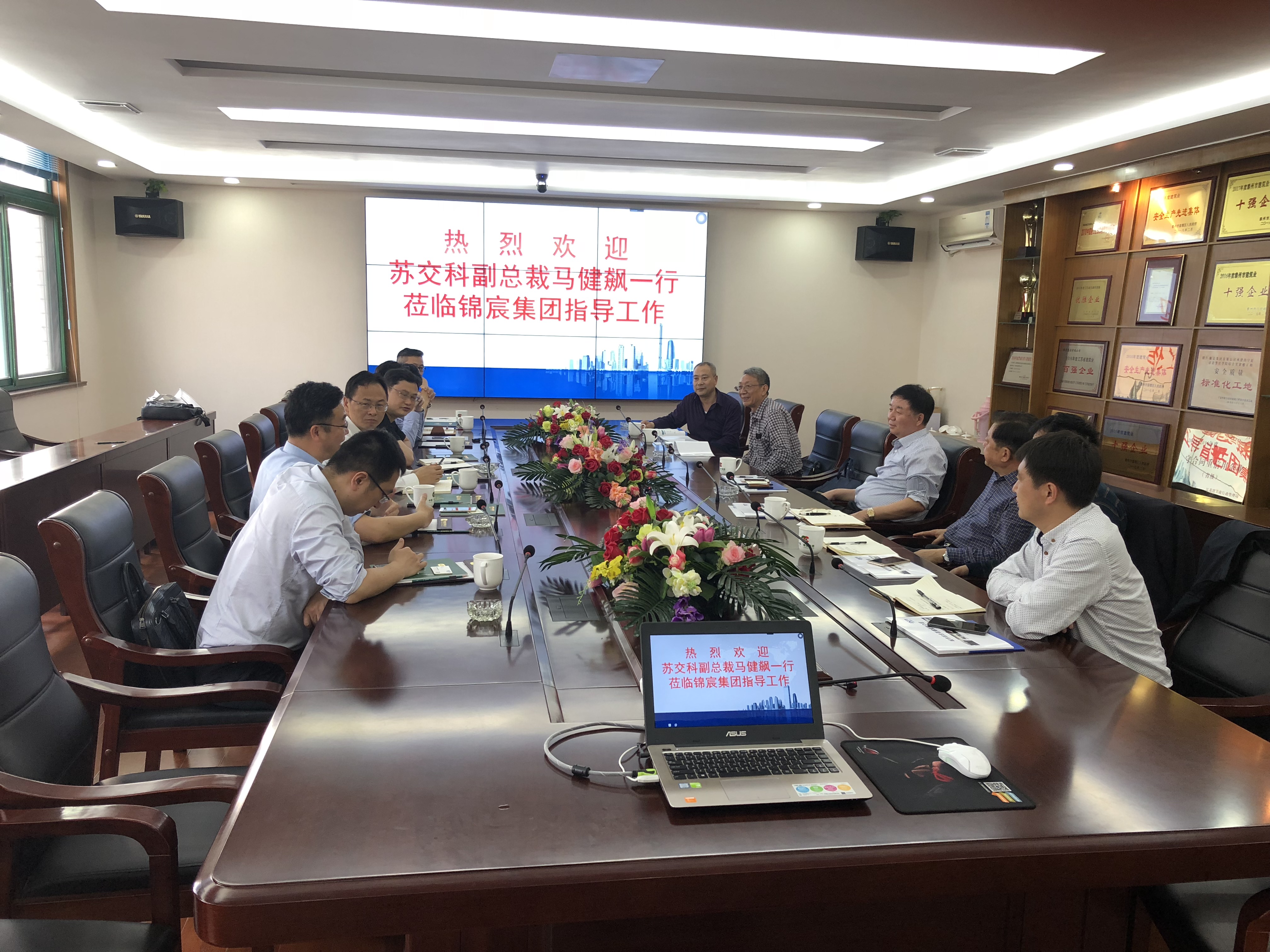 4月3日,苏交科集团股份有限公司副总裁马健飚一行,到集团公司考察洽谈。集团公司董事长李焕军、顾问颜大龙以及相关部门负责人参加活动。通过考察洽谈,双方表示要进一步深入对接,制定出详细的策划方案,促进深度合作、实现共同发展。
