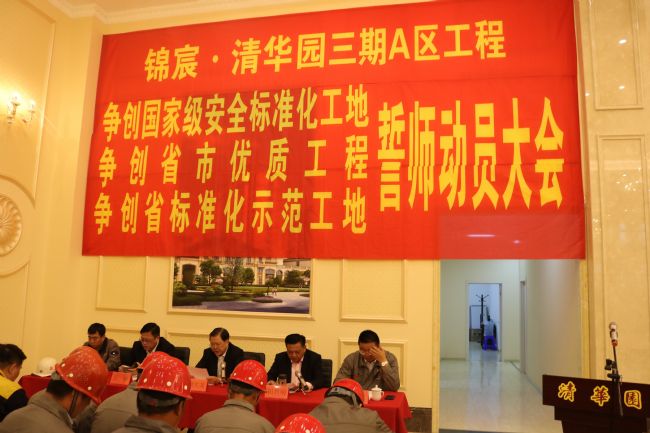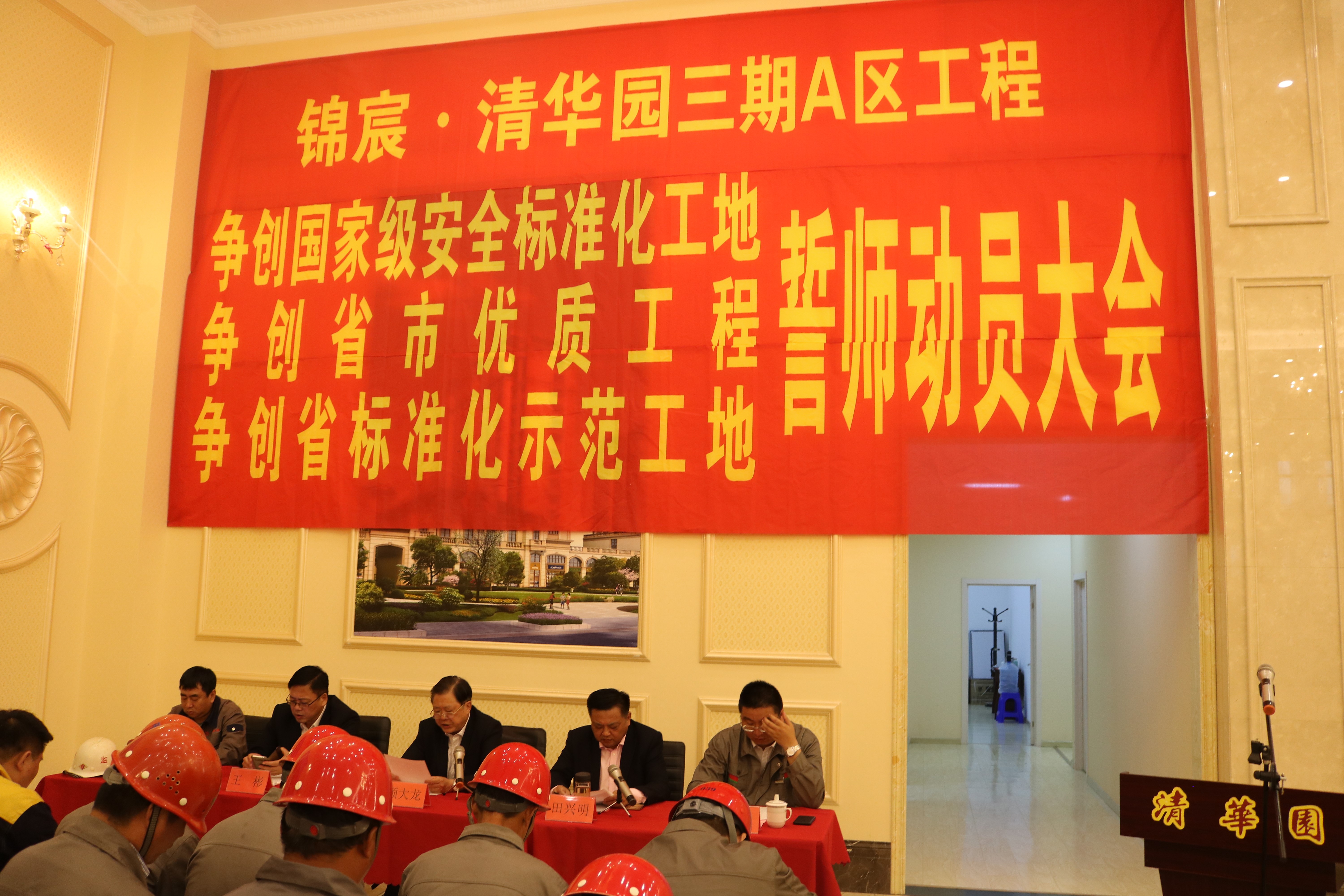5月28日,吉林凯发k8国际房地产开发有限公司、凯发k8国际集团有限公司梅河口直属项目部在吉林省梅河口市清华园售楼中心召开了清华园三期工程A标争创吉林省“长白山”杯优质工程暨争创国家“三A”级工地、吉林省房屋建筑工程标准化工地誓师动员大会,项目部、监理部、物业部、开发公司全体管理人员、各劳务班组负责人、材料供应商、房屋销售人员等120多人出席了会议;会议由开发公司常务副总田兴明同志主持,集团公司领导颜大龙同志作了题为《精益求精再铸省优工程 一心同功争创标化示范工地》的动员报告;项目经理吴伟等11名同志作了表态发言。会议要求全体管理人员、劳务负责人充分认识争创吉林省“长白山”杯优质工程的重要性,争创国家“3A”级工地、省标准化工地的必要性,进一步狠抓当前生产、抢抓销售机遇的紧迫性。确保二期工程2018年9月10日前交房、三期A标段8月份全面封顶、三期B标段9月份破土动工。确保清华园质量口碑、现场口碑继续名列梅河前茅!确保社会效益、企业经济效益双丰收!
