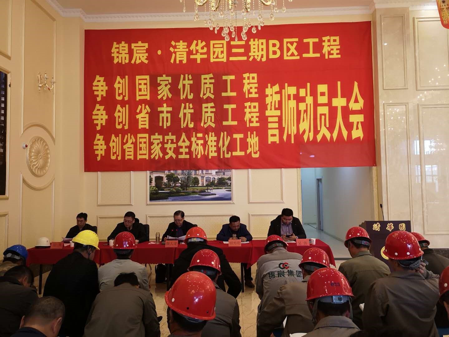 2019年4月28日下午3时,吉林凯发k8国际房地产开发有限公司、凯发k8国际集团有限公司梅河口直属项目部在吉林省梅河口市清华园售楼中心召开了清华园三期B区工程争创国家优质工程、争创省市优质工程、争创省国家级安全标准化工地誓师再动员大会,项目部、监理部、物业部、开发公司全体管理人员、各劳务班组负责人、材料供应商、房屋销售人员等100多人出席了会议,会议由开发公司副总经理王彬同志主持。
