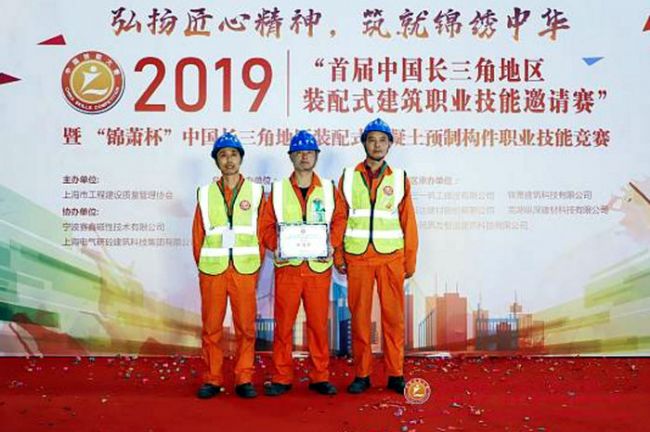 为深入贯彻习近平新时代中国特色主义思想和党的十九大提出的“建设知识型、技能型、创新型劳动者大军,弘扬劳模精神和工匠精神,营造劳动光荣的社会风尚和精益求精的敬业风气”,为装配式建筑技能人才搭建切磋技艺、交流经验、提高技能、展现风采的平台,构建崇尚技能的良好社会氛围,由上海市住房和城乡建设管理委员会、上海市人力资源和社会保障局、上海市总工会、共青团上海市委员会指导,江苏省人民政府驻上海办事处、浙江省人民政府驻上海办事处支持,上海市建设协会、上海市建筑施工行业协会、上海市工程建设质量管理协会、上海市建设交通工会、上海市建设交通青年人才协会联合主办的“首届中国长三角地区装配式职业技能邀请赛”暨“锦萧杯”中国长三角地区装配式混凝土预制构件职业技能竞赛总决赛于11月25日在上海建工五建集团方泰基地圆满落幕。江苏宇辉在决赛中获得“优胜奖”