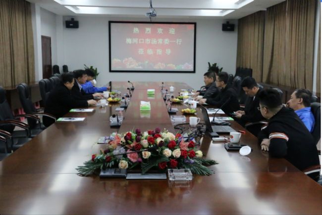 2021年4月11日上午, 梅河口市委常委、统战部部长汤培成、住房和城乡建设局局长李永发、住房和城乡建设局建工科科长刘吉忠、人民政府办公室综合科科长吴谦一行莅临江苏宇辉指导工作。集团公司董事长李焕军、顾问颜大龙,江苏宇辉总经理全文林、副总经理兼总工程师吴仲勤参加活动。