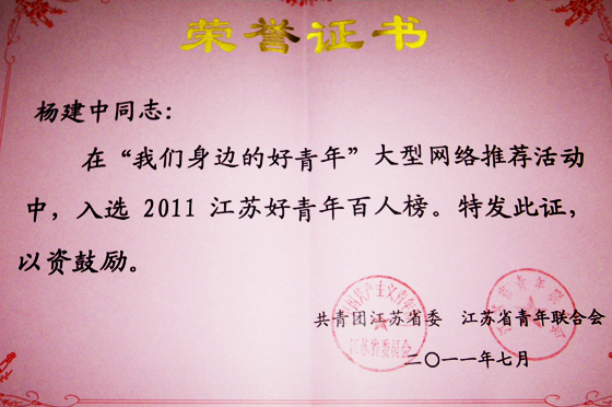 杨建中同志在江苏省“我们身边的好青年”大型网络推荐活动中,入选
