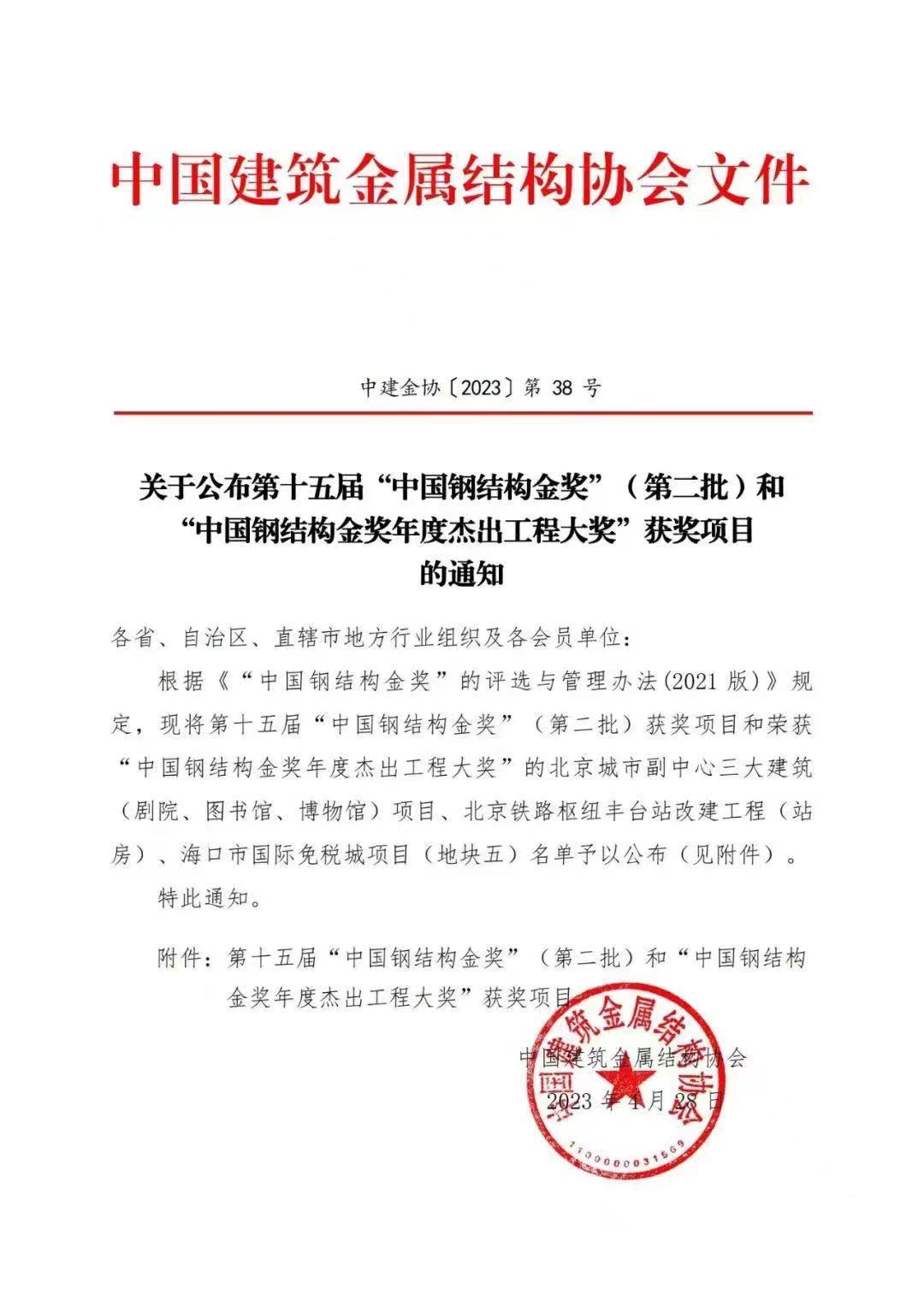 据悉,中国建筑工程钢结构金奖,是经国务院批准的建筑领域国家级的优质工程奖,是中国建筑钢结构行业工程质量的最高荣誉,每年评选一次,评选对象是质量达到国内领先水平的各类建筑钢结构工程。