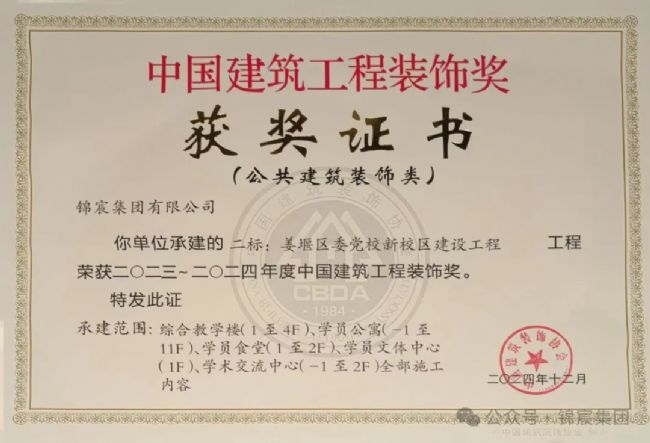 中国建筑工程装饰奖是经住房和城乡建设部批准,由中国建筑装饰协会主办的评选活动,是中国建筑装饰行业的最高荣誉奖,代表了全国建筑装饰装修领域内工程质量最高水平。