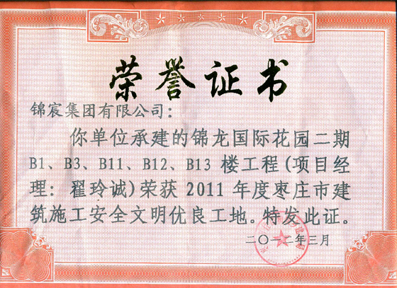 山东分公司2011年承建的锦龙国际花园二期工程,通过强化内部管理、规范施工程序,不断提高管理人员的素质,全面推广“安全生产、文明施工”的新理念,坚决执行安全生产标准化。在施工过程中,受到了上级有关部门及领导的多次好评,被评为2011年度枣庄市“安全生产、文明施工”先进单位。