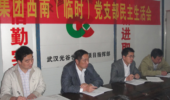 西南(临时)党支部还以十八大的召开为契机,在武汉光谷世界城项目指挥部召开了民主生活会,开展批评和自我批评,就思想、作风和工作上的问题互相交换意见,谈心通气,互相帮助,互相监督、总结经验,从而进一步统一思想认识,明确工作重点,实现项目效益、企业信誉的双提升。