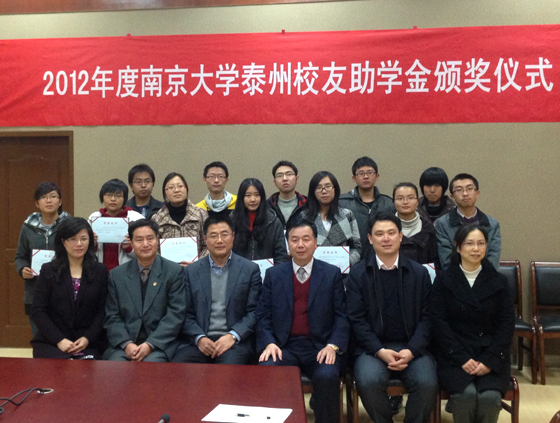 庄菁副秘书长宣读了《关于授予谢蓉等12名同学2012年度南京大学泰州校友助学金的决定》,泰州市南京大学校友会向获奖同学颁发荣誉证书及每人5000元的助学金。