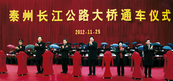 盛世建桥,飞虹越江。昨天上午,备受瞩目的泰州长江公路大桥在全体建设者1700多个日夜的奋力拼搏后建成通车。自此,全省建成通车的跨江公路大桥已达8座。交通运输部党组书记、部长杨传堂,省委书记、省人大常委会主任罗志军,省长李学勇,省政协主席张连珍,南京军区党委常委、联勤部部长杨建华,省委常委、常务副省长李云峰共同为大桥建成通车剪彩。省委常委、省委秘书长樊金龙,省人大常委会副主任朱龙生,南京军区国动委委员、联勤部副部长于天明,省军区政治部主任吕先景出席通车仪式。通车仪式上,罗志军向泰州、镇江、常州三市负责同志赠送泰州大桥桥模,市委书记张雷、镇江市委书记张敬华、常州市长姚晓东分别代表各市接受馈赠。杨传堂、李学勇分别讲话。副省长史和平主持仪式。省政府秘书长毛伟明,省有关部门负责同志,市长徐郭平等也一同出席通车仪式。