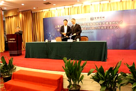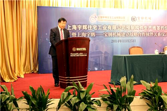 11月25日上午,上海宇辉住宅工业有限公司预制构件生产线签约仪式暨上海宇辉--上海宝钢工业技术有限公司机械分公司战略协议签约仪式,在上海宝钢集团宝山宾馆友谊会堂召开。宝钢工程集团代表,上海多家建筑单位代表,本地多家知名民营企业代表,以及新闻媒体代表等参加会议,集团公司董事长李焕军出席签约仪式并讲话。