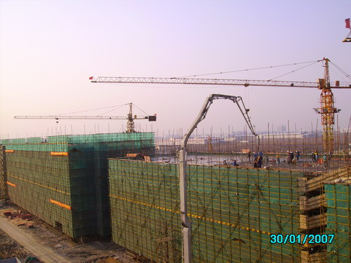 该工程是外资项目,总建筑面积10.3万M2,为全框架结构。苏州分公司于2006年10月开工承建了一期工程4.3万M2,共6幢6层职工宿舍楼,工程量大,工期紧,业主要求242个日历天全部竣工。工程开工伊始,苏州分公司经理王蔚多次召集技术骨干,共同研究施工方案,将工程量由各施工班组分解承包,并抽调施工经验丰富的技术人员充实到项目一线,共同研究解决施工中的难题。项目部每天早上召集班组长进行技术交底,确保工程质量。经过400多名工人的共同努力,D6、D9、D12三幢楼实现提前封顶,D7、D10、D13三幢楼施工进展顺利。