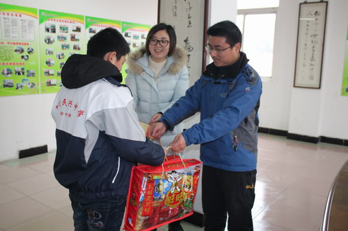 222日上午,校团委书记顾娟娟、团委副书记朱方喆、团委委员陆海雯等将新年大礼包(新华书店购书卡、新年小礼物)送到了该校初一13班费同学手中,并与费同学进行了简短的交谈,鼓励他好好学习、天天向上。
