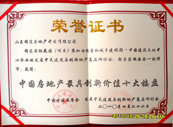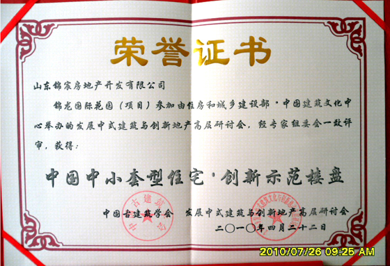 山东凯发k8国际房地产开发有限公司开发的锦龙·国际花园继二〇〇八年获得建设部·中国建筑文化中心、中国魅力楼盘组委会颁发的“中国建筑文化典范十大楼盘”、“中国规划设计十大创新楼盘”以来,一如既往精益求精,于二〇一〇年四月又获得中国古建筑学会颁发的“中国中小套型住宅·创新示范楼盘”、“中国房地产最具创新价值十大楼盘”荣誉称号。