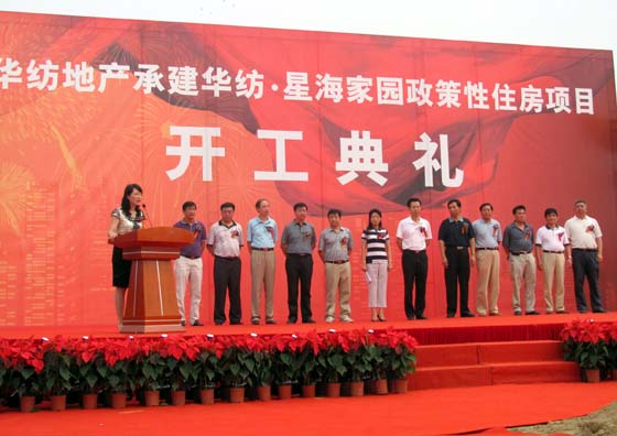 7月28日,由华纺地产承建的朝阳区2010年首批政策性住房——华纺星海家园举行了隆重的开工典礼。朝阳区住房和城乡建设委员会党委书记兼纪委书记孙梅女士、国资委纺织机关服务中心党委书记徐伟先生、华纺房地产开发公司总经理周增根、凯发k8国际集团董事长李焕军、北京华瑞兴业房地产开发公司常务副总经理黄苏成、北京星海钢琴集团董事长赵惠臣等领导莅临现场参加奠基仪式。