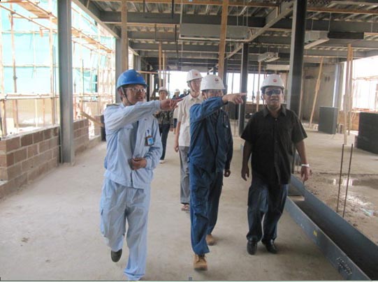 集团副总经理蒋存基向杨大使一行介绍了目前项目进展情况,随后杨大使一行实地视察中方公寓的样板房、设备制冷机房与服务用房。项目采用钢结构主体框架技术、所有建筑集中制冷,特别是大量新型节能环保材料的运用得到杨大使的好评。在视察过程中,杨大使对项目部大量聘用当地雇员与中方人员一起工作,提高当地员工技术水平,增进中乍两国友谊的做法高度赞扬,对施工现场的安全管理、文明施工和施工质量等给予肯定。